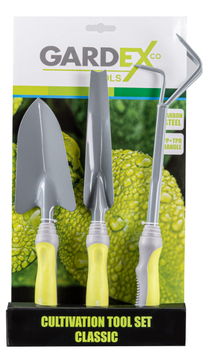 Градинския комплект на Gardex включва всичко необходимо за основната градинска работа, подходящ както любители, така и за професионални градинари. Ергономичния му дизайн предоставя по-голямо удобство и по-малко умора по време на работа. Съдържа 3 бр. инструменти за различни дейности.