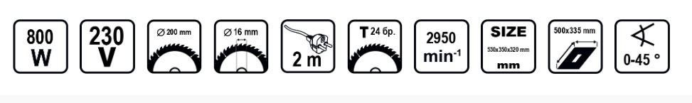 Характеристики Диаметър на диск 200 mm Диаметър на отвора 16 mm Накланяне на диска ляво/дясно 45/45 ° Макс. дълбочина на рязане (45 °) 35 mm Макс. дълбочина на рязане (90 °) 45 mm Зъби на диска 24 Обороти на празен ход 2950 min-1 Захранващо напрежение AC 230 V Номинална мощност 800 W Дължина на кабела 2 m Размер 530x350x320 mm Размери на плота 500x335 mm Raider - номер на артикул 054105