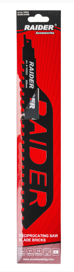 Ножа за саблен трион на Raider e подходящ за рязане на тухли, бетонни блокчета и строителни материали с висока плътност. Характеризира се с уникален фирмен дизайн и благодарение на по-голямата му дължина, е възможно дълбоко рязане на по-дебели тухли и строителни материали.