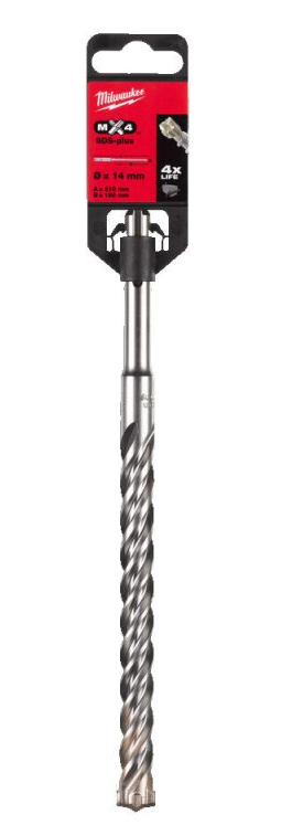 Свредлото на Milwaukee MX4 SDS-PLUS ф14 x 210мм е предназначено за пробиване в бетон, армиран бетон и зидария.