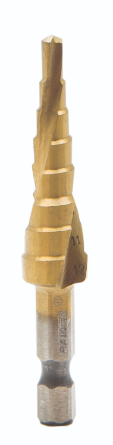 Стъпаловидното свредло за ламарина на Raider е изработено от висококачествена HSS+TIN стомана със самоцентриращ връх. Спираловидния канал намалява вибрациите и осигурява по-бързо пробиване в материала.