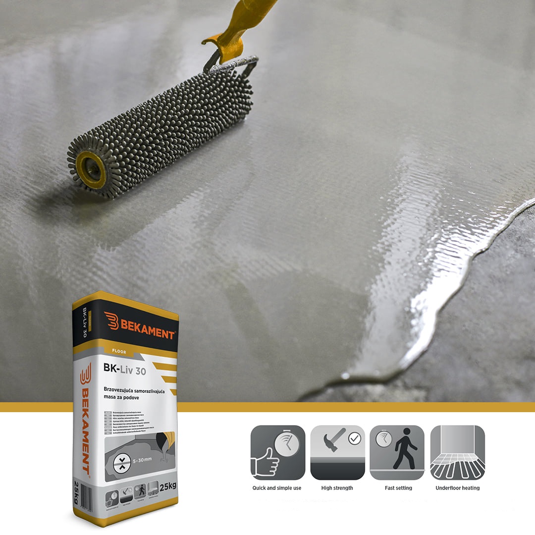 The substrate on which the mass is applied must be firm, clean, dusty, free of grease and poorly bonded parts. Before applying BK-Liv 30, coat the substrate with BK-Ultra Prime, while in the case of application on old ceramic tiles, use BK-Bond as a substrate. Substrate drying time is minimum 4 hours. The preparation of the mass is done by adding powder in 19-20% of water, until complete homogenization. Leave the mass to stand for 5 minutes and then stir again. The mass is poured on the substrate in one layer using a suitable tool, and after pouring, it is desirable to coat the surface with a special needle roller (“hedgehog” roller), in order to expel air bubbles. Use the mixed mass within 45 minutes. See the product data sheet for detailed instructions.