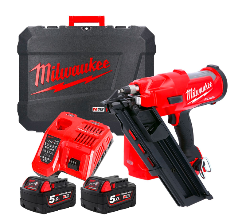 Milwaukee M18FFN-0C cordless taker kit with 2 pcs. M18B5 batteries and M12-18FC charger