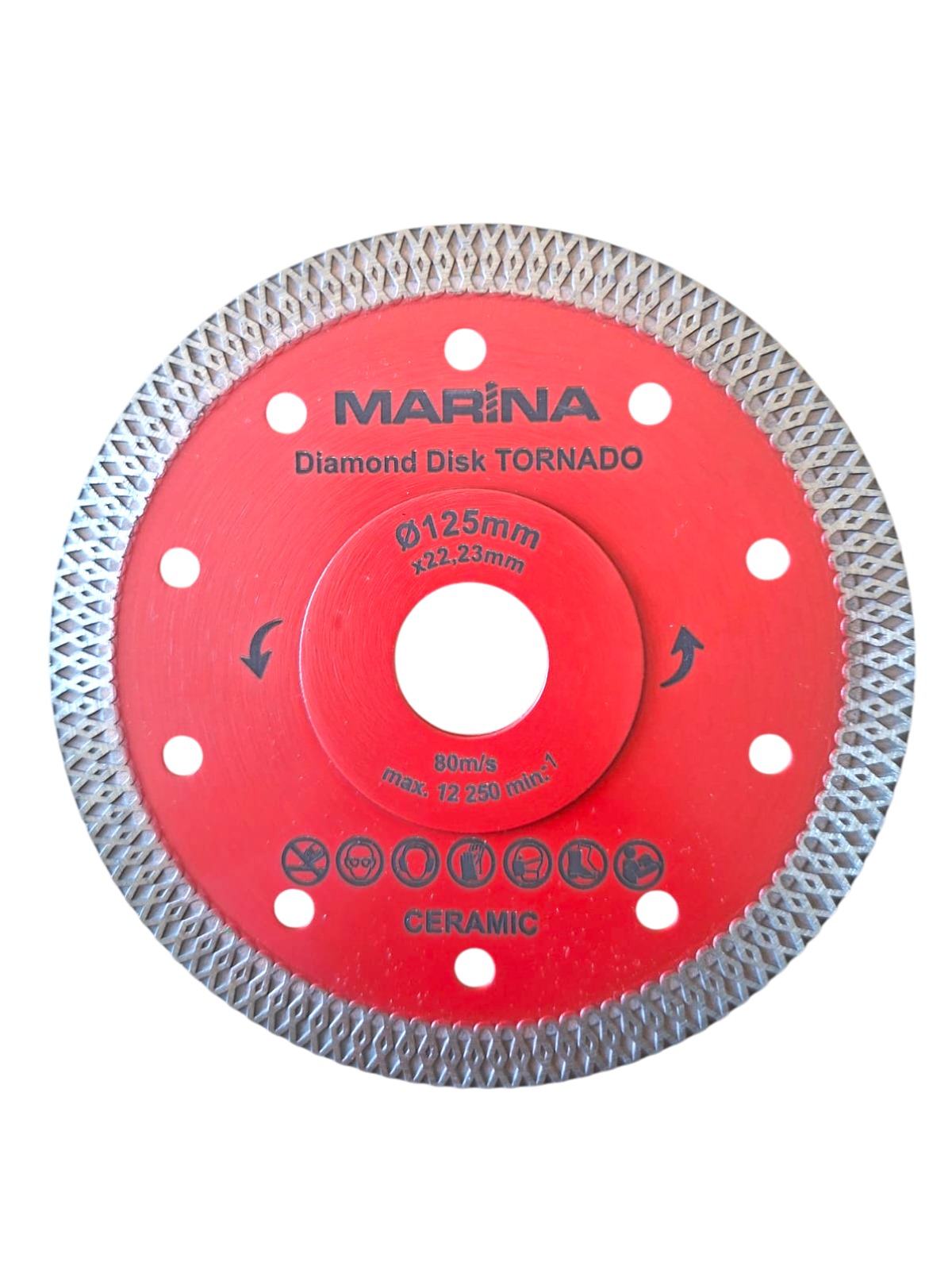 The Tornado diamond blade is a specialized cutting tool with a “mesh” pattern edge, designed for fast, clean and efficient cutting of hard materials such as porcelain, granite and tiles. The unique mesh design and ventilation holes provide improved cooling and dust collection, which prevents chipping, extends blade life and ensures stable cuts. This type of blade is used by both professionals and home users, when it is necessary to cut a variety of hard materials quickly and with a high-quality finish.