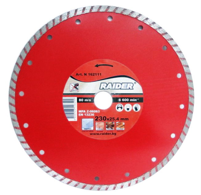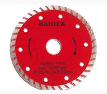 Raider's TURBO diamond blade features a thin segment for fast cutting and cooling holes to prevent damage from overheating. It is suitable for cutting porcelain, granite, concrete, faience, brick and other hard, dense materials.