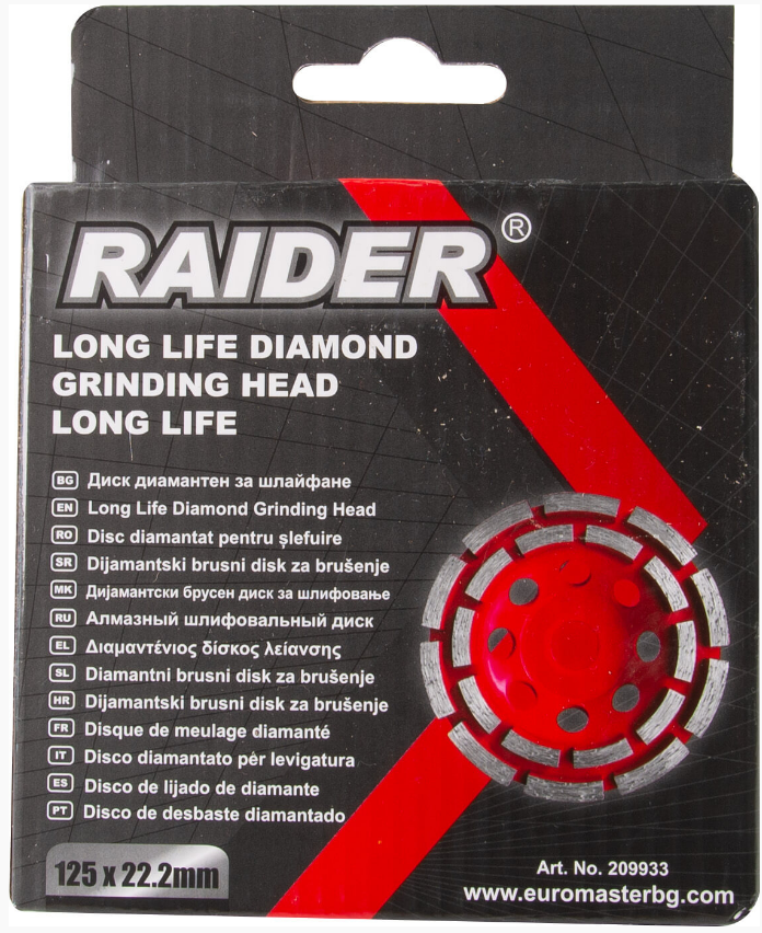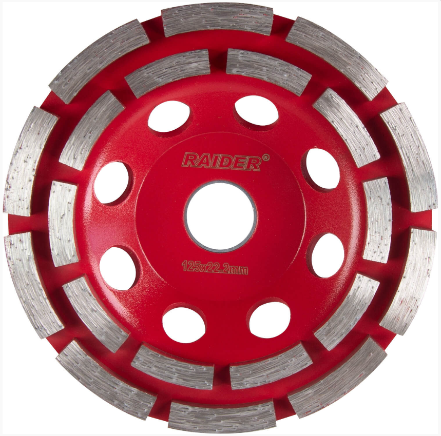 Raider diamond disc is characterized by excellent durability, smooth grinding, and long service life when grinding concrete. The double row of 20 segments ensures fewer traces of rotation on the surface.